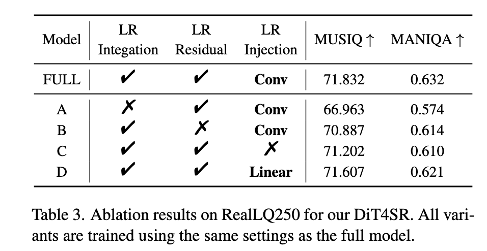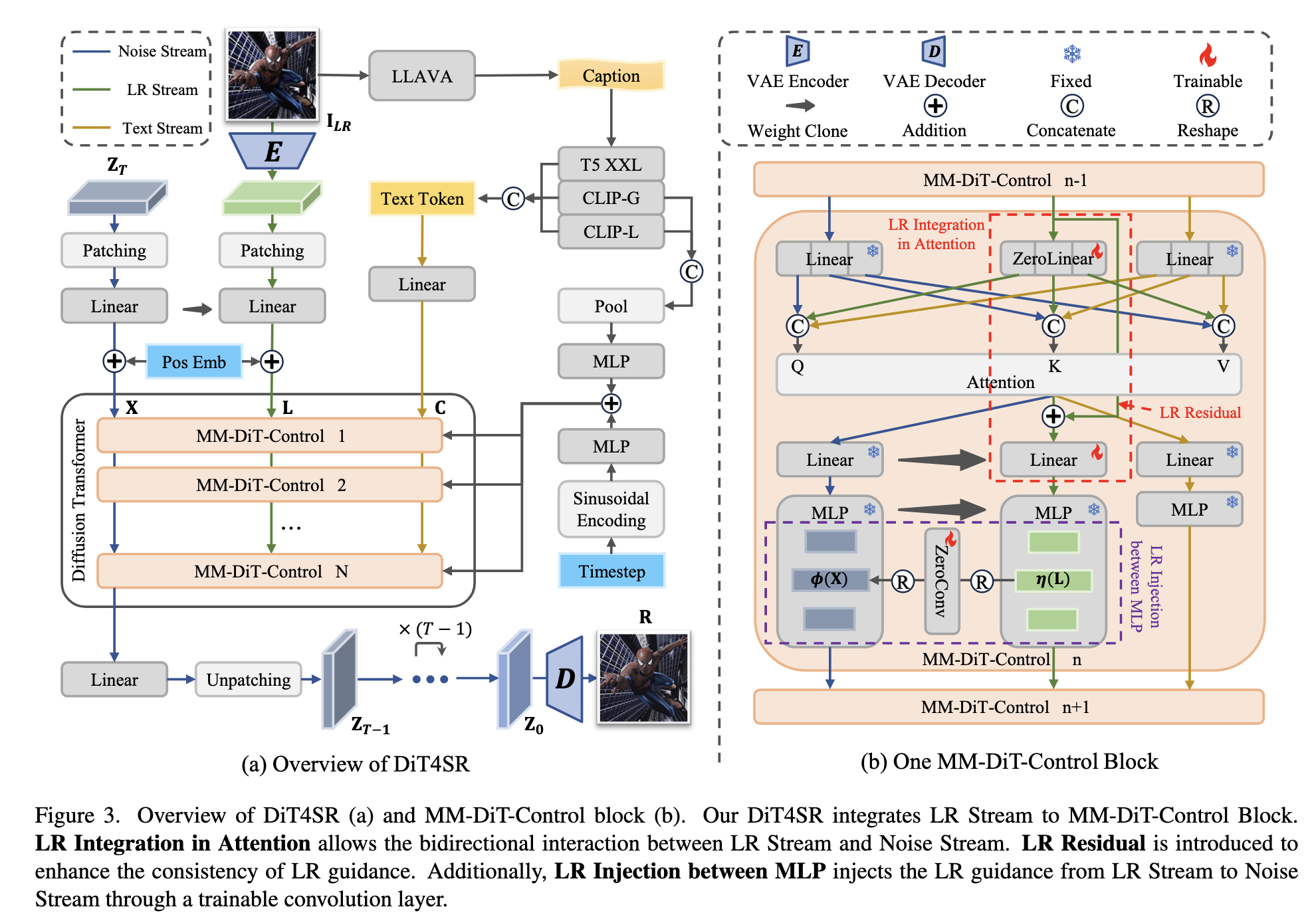 - LR Residual path:确保 LR latent 在深层 DiT block 中仍保持稳定、连续的指导能力。