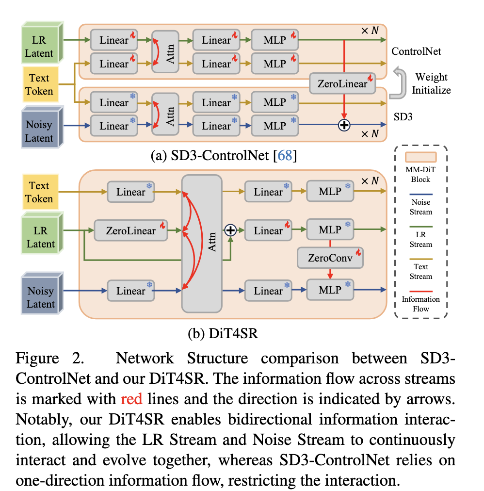 不同于 ControlNet 复制模块、独立注入的方式,作者将 LR latent 直接集成到每个MM-DiT block 内部,创建三路流: