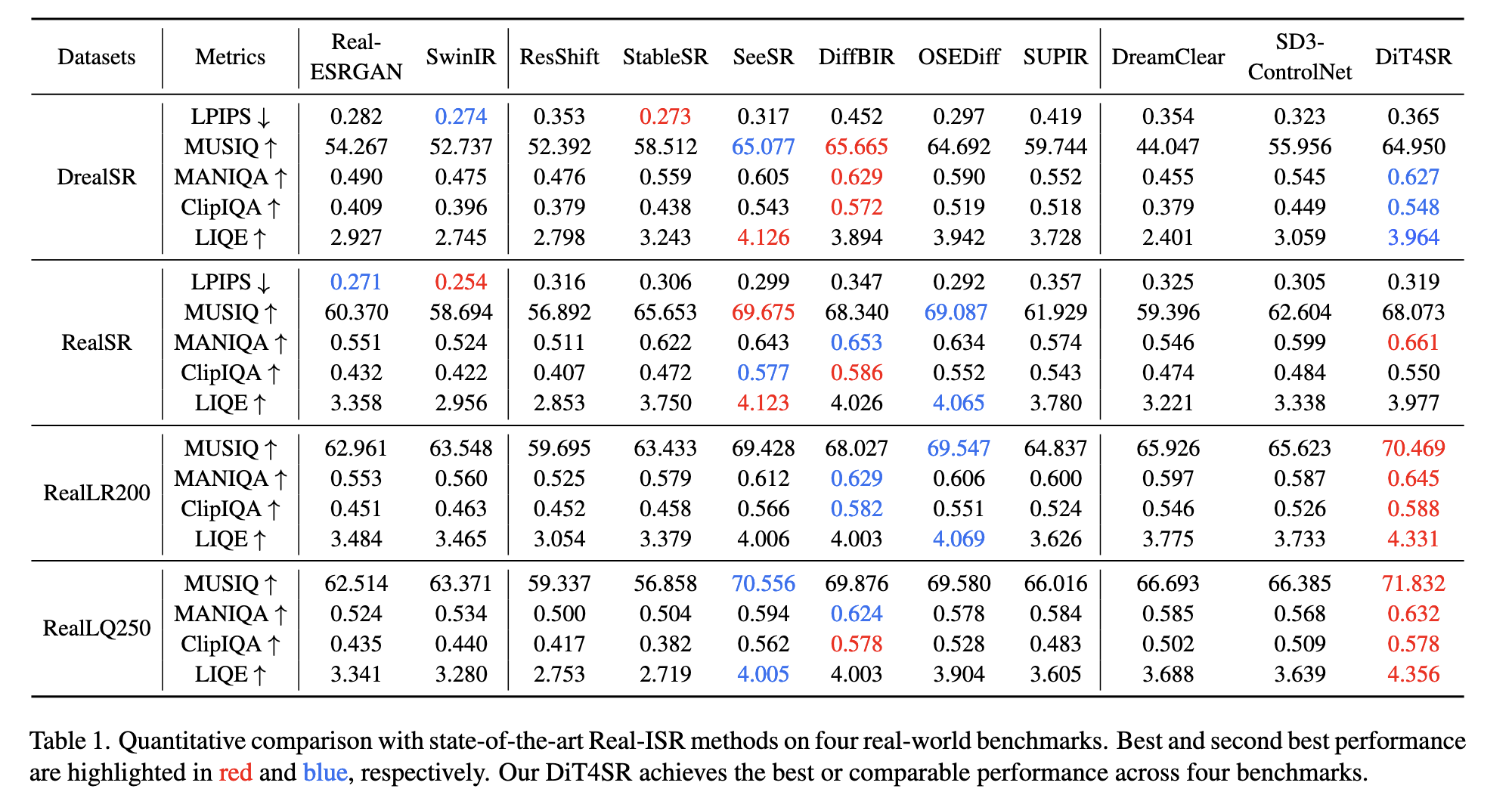 - DiT4SR 在 RealLR200、RealLQ250 数据集 全面第一